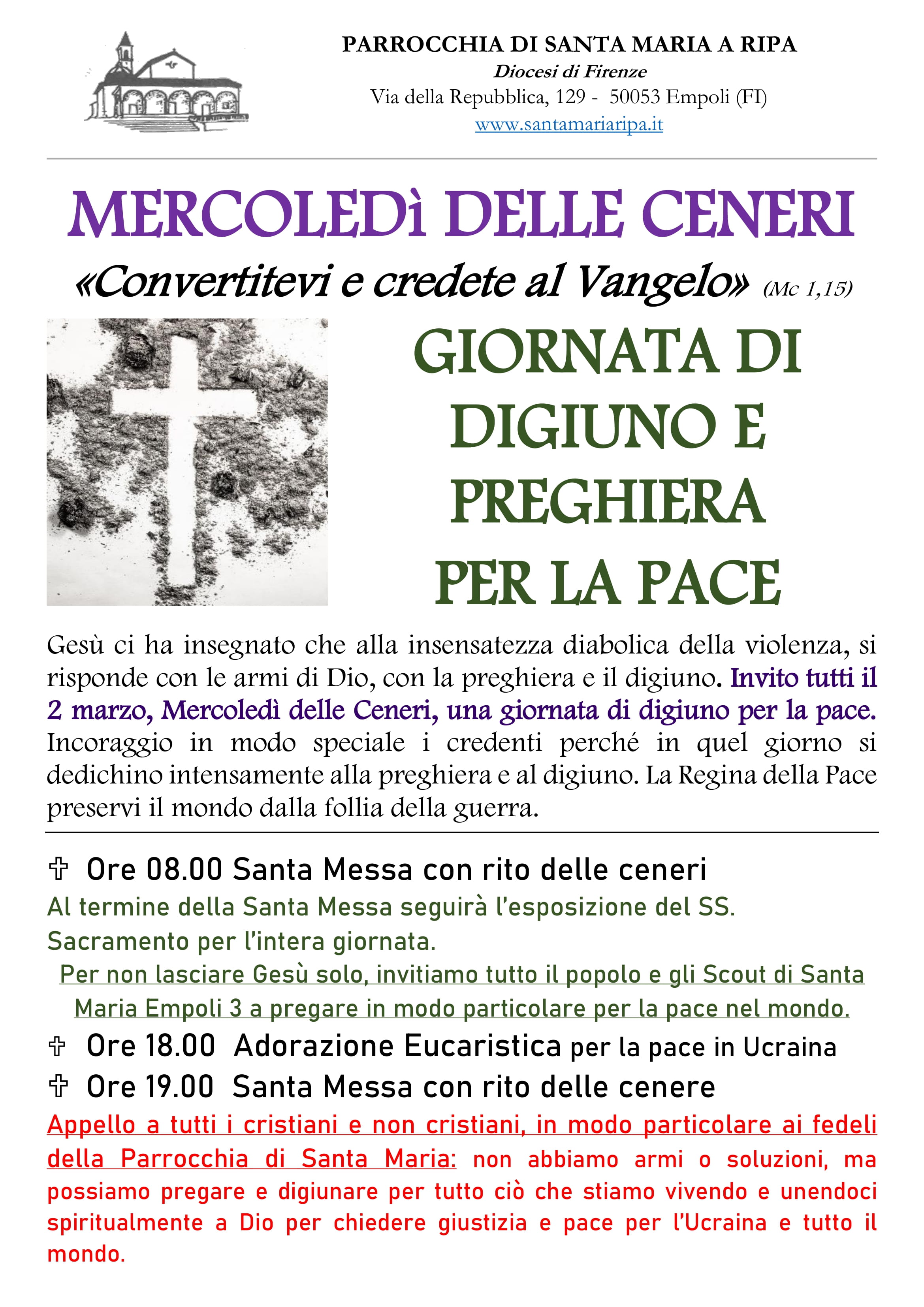 2 Marzo, Mercoledì delle Ceneri, Giornata di digiuno per la pace Pubblicato giorno 25 febbraio 2022 - Attività
