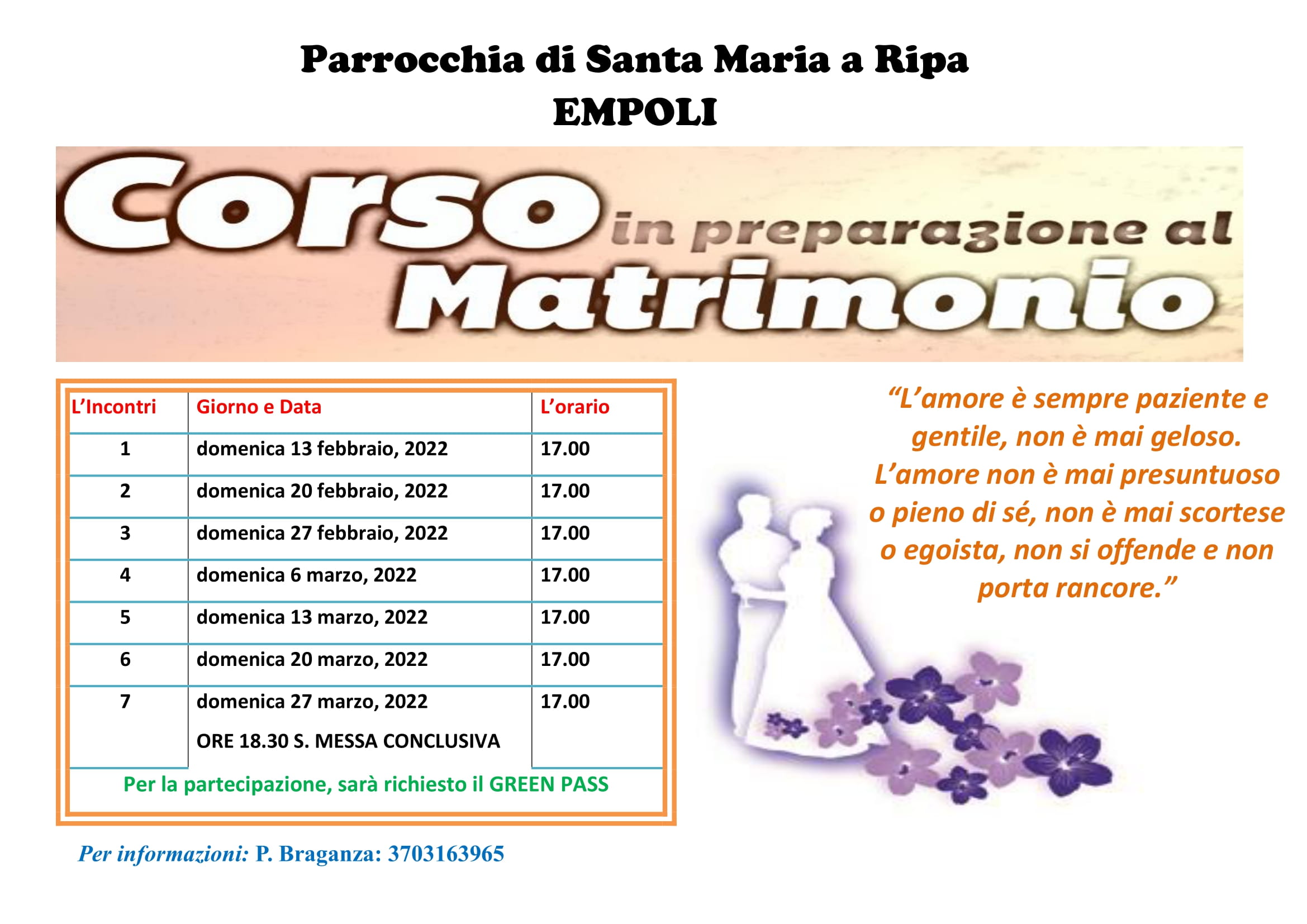 Corso in preparazione al Matrimonio Iscrizione Aperte Inizio Domenica 13 Febbraio ore 17:00 Pubblicato giorno 19 gennaio 2022 - Attività