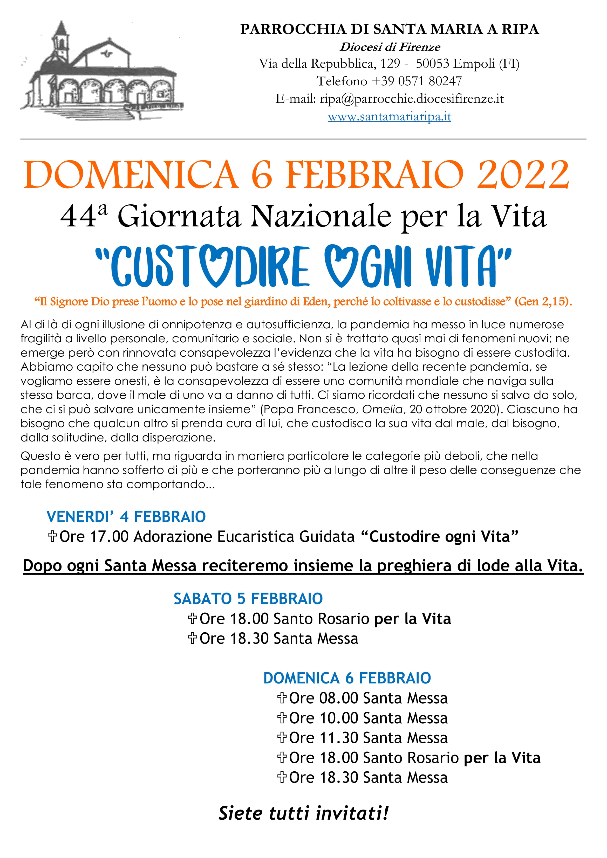 Domenica 6 Febbraio 2022 44ª Giornata Nazionale per la Vita “Custodire ogni vita” Pubblicato giorno 28 gennaio 2022 - Attività