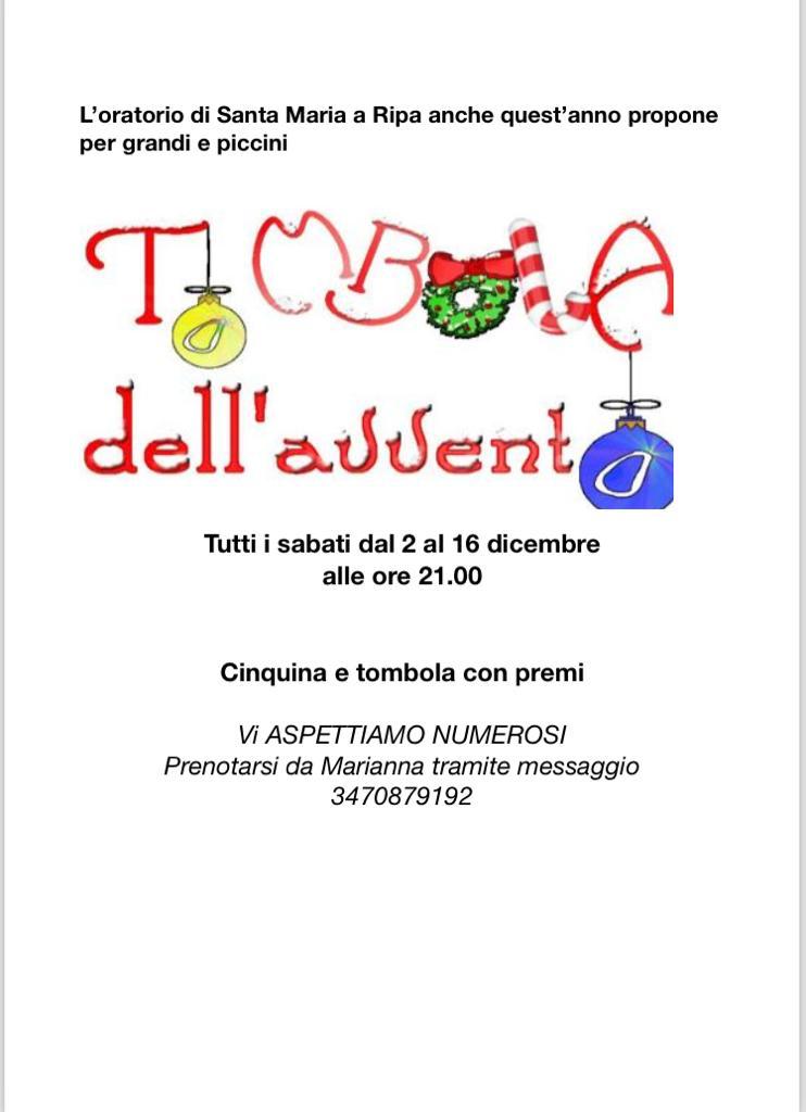 TOMBOLA DELL’AVVENTO Sabato 2, 9 e 16 Dicembre ore 21:00 Pubblicato giorno 24 novembre 2023 - Dettaglio eventi Evento finito il 16 dicembre 2023 Luogo: Oratorio Santa Maria a Ripa