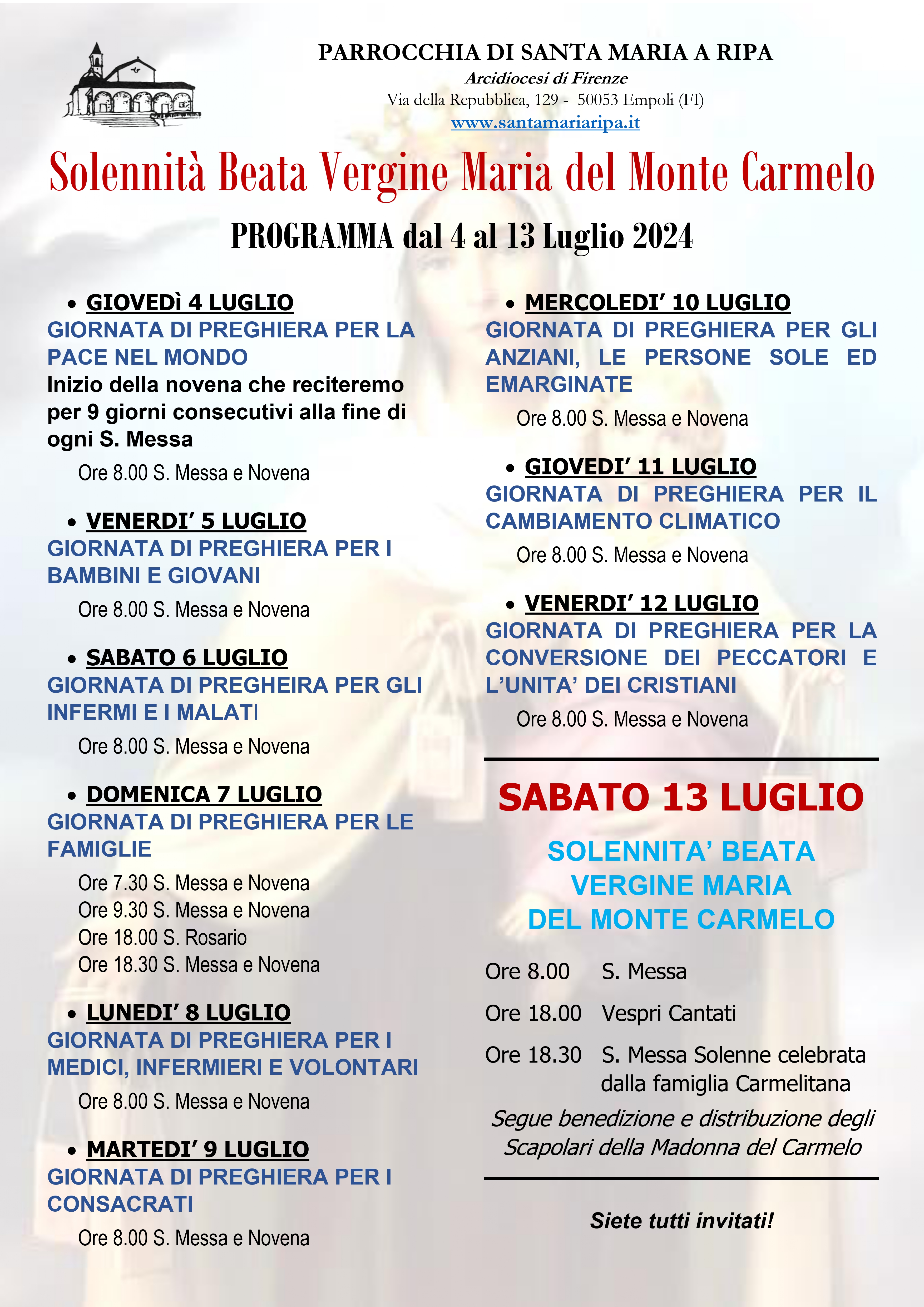 Solennità Beata Vergine Maria del Monte Carmelo PROGRAMMA dal 4 al 13 Luglio 2024